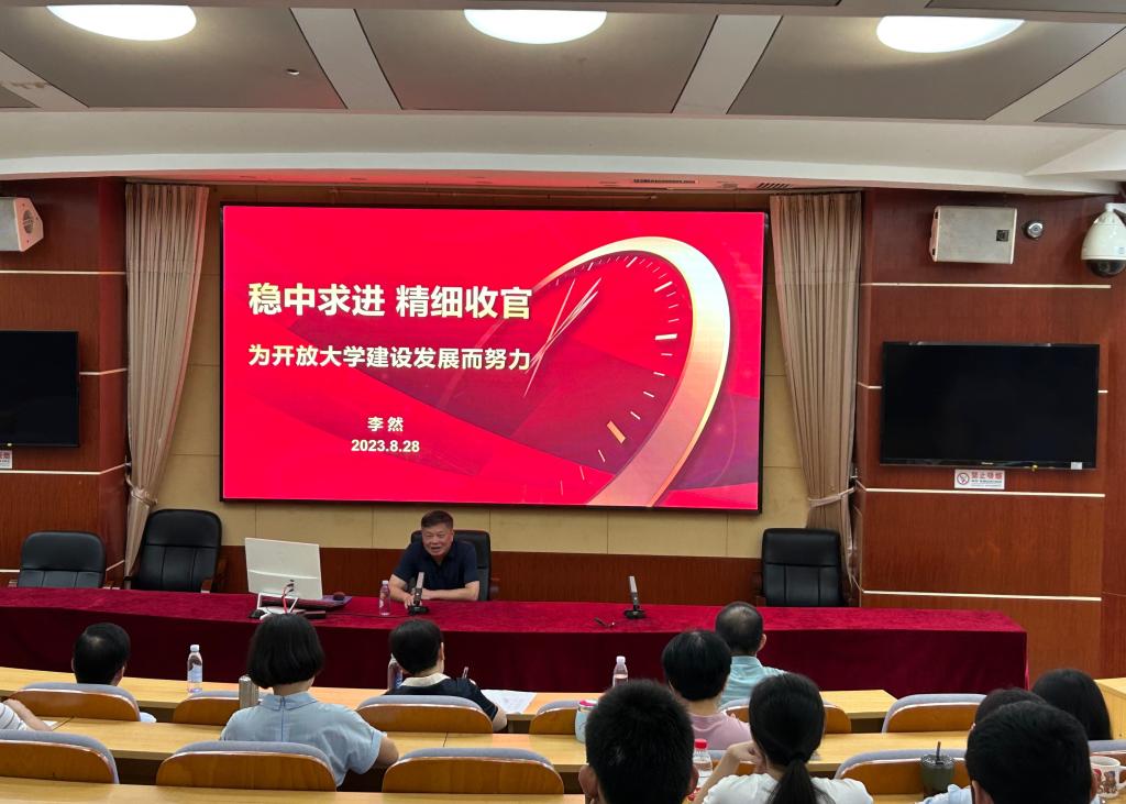 8月28日下午,漳州开放大学召开2023年秋季新学期全体教职工大会。学校党委书记、校长李然主持会议,结合部署新学期工作,作题为《稳中求进 精细收官——为开放大学建设发展而努力》的报告。
