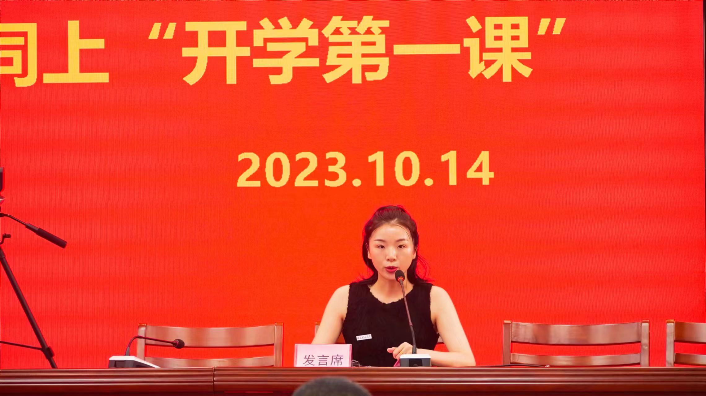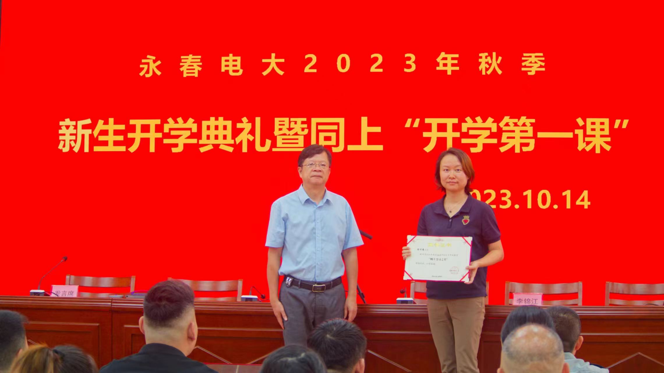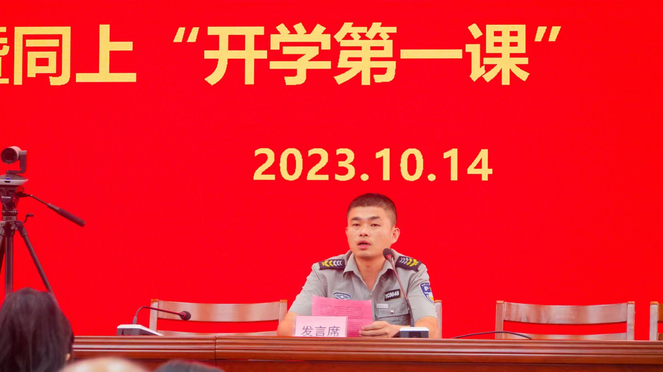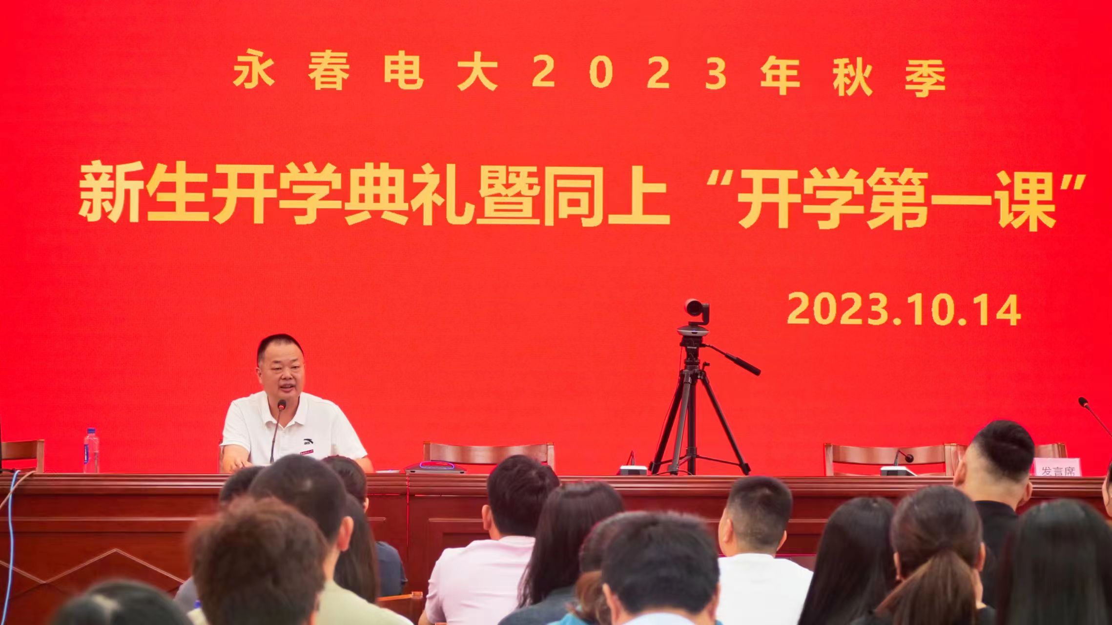 永春学院2023年秋季本科2班班长,永春县至信保安服务有限公司工会主席、办公室副主任、押运部副经理,泉州市首届“十佳保安员”林金智代表新生发言,表达了对开放大学生活的美好憧憬和努力奋斗的决心,将在永春学院这片沃土上,练就过硬本领,为全面建设社会主义现代化生态永春添砖加瓦。
