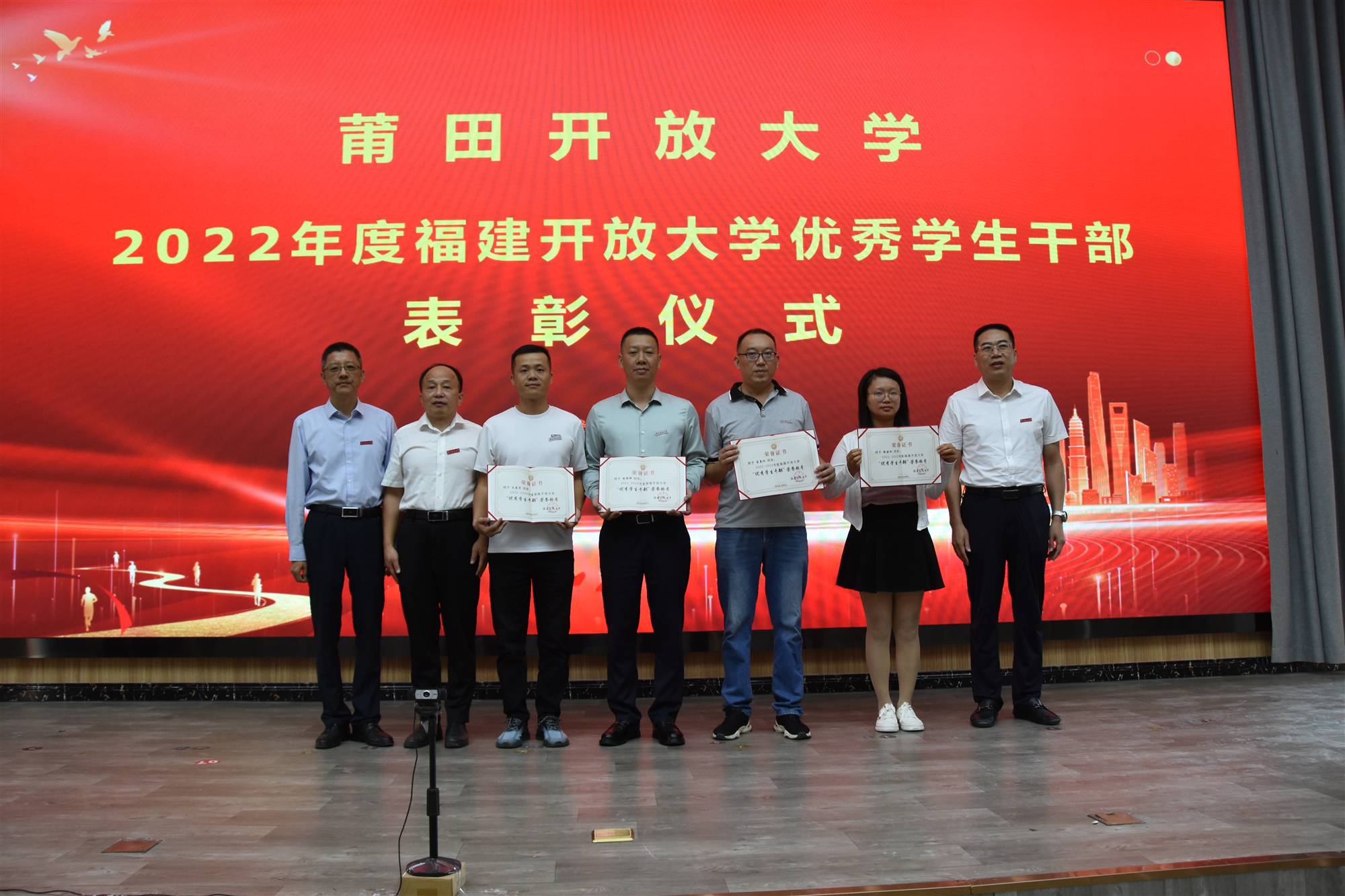 开学典礼在嘹亮雄壮的国歌声中开始。典礼上学校领导为获得2022年福建开放大学优秀学生干部颁发荣誉证书,并为新生佩戴校徽。