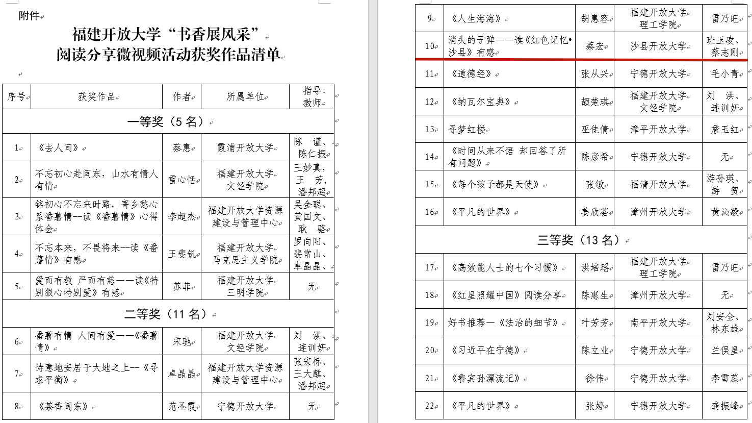 为深入学习贯彻党的二十大精神,扎实推进全民阅读,根据《关于组织全省办学体系开展“书香展风采”阅读分享微视频活动的通知》文件精神,学校精心准备,踊跃参与。10月30日福建开放大学公布获奖名单,沙县开放大学选送的作品《消失的子弹——读《红色记忆•沙县》有感》(作者 蔡宏 指导教师 班玉凌、蔡志刚)获得二等奖。学校将继续进一步提升师生知识涵养,营造爱读书、读好书、善读书的浓厚氛围,创作出更多的优秀作品 。