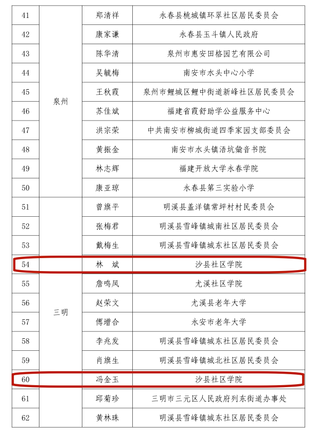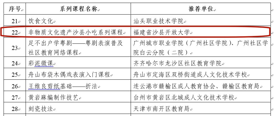 根据 《教育部关于印发 〈学习型社会建设重点任务〉的通知》加强学习型社区建设的有关要求,经各省级教育行政部门推荐、专家综合把关、网站公示等环节,100 项县域社区学习中心典型案例、300 门社区教育品牌课程名单予以推介公布。沙县开放大学推荐的《沙县区农村老年教育学习中心典型案例》、《非物质文化遗产沙县小吃系列课程》入选推介名单。