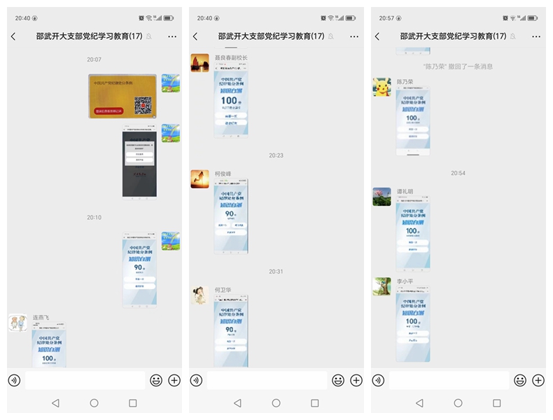 6月11日,一场别开生面的《中国共产党纪律处分条例》(以下简称《条例》)知识竞赛活动在邵武开放大学党支部学习交流微信群展开。主持人通过微信群分享参赛二维码,党员教师们通过扫码答题,作答完立即将自己的答题结果分享在群里。工作人员进行逐一登记,根据得分和作答时间排名并及时公布比赛结果。