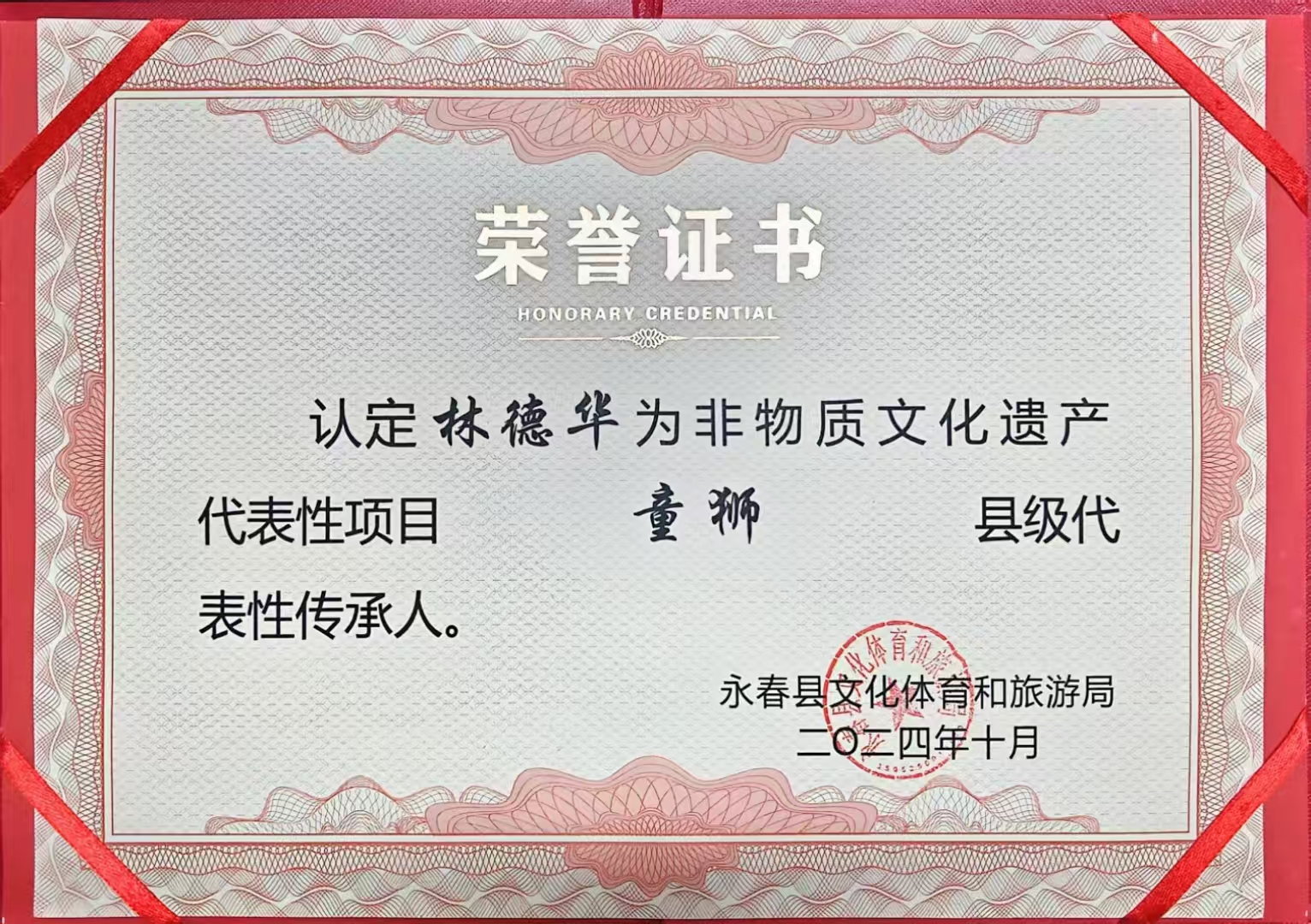 林德华,出生于永春县外山乡云峰村武术世家,继承了先辈童狮、五祖白鹤拳技艺,现为福建云峰童狮健康管理有限公司总经理,致力于童狮非物质文化遗产的保护与传承。其报送的有关童狮作品先后荣获“全福游、有全福”最美福建旅游产品创意设计大赛(旅游线路)最佳创意奖,福建文创奖非遗文创开发类入围奖,第三届福建省(永春)乡村振兴“师带徒”引凤项目大赛入围奖等表彰。学习强国、福建省广播电视新闻综合频道、泉州广播电视台、泉州晚报、东南早报、海峡都市报等多家媒体对其与童狮的渊源和童狮技艺进行了报道。