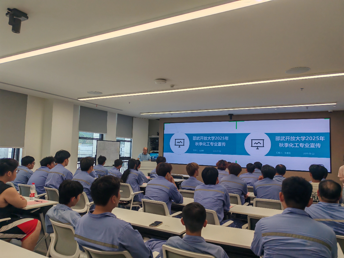 8月26日,邵武开放大学副校长李小平带领教务处主任张建良和技术处主任张玉维到邵武市经济开发区金塘工业园福建华谊三爱富氟佑新材料有限公司开展秋季招生宣传推介活动。张建良从专业核心课程、学习与考试、报名流程等方面向该公司30余名新入职人员重点推介了应用化工技术专业,并针对“农民工助学圆梦项目”申请条件和相关招生政策进行了解释说明。