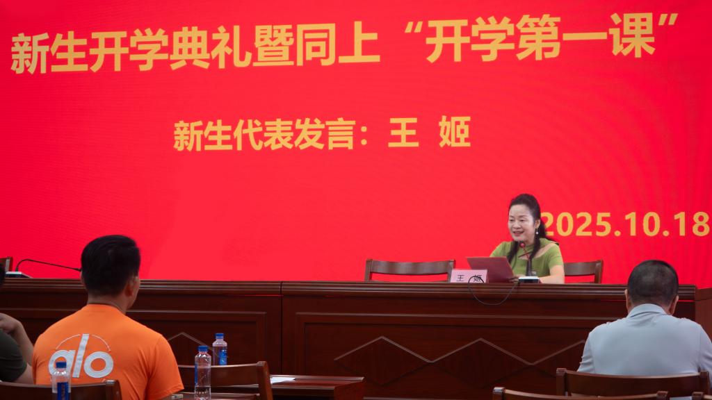 2025届专科行政管理(乡村管理方向)毕业生、2025年秋季本科网络与新媒体专业新生王姬作为代表发言。她身兼学院本科1班班长、泉州锦林环保高新材料有限公司采购总监及永春县徒步运动协会副会长数职。读专科期间,学院灵活教学助她平衡工学,她获评校优秀学生干部、优秀毕业生,还获学院“书香校园”书评大赛一等奖。为补短板、助企业数字化转型,她选择攻读本科该专业。她勉励新生珍惜学习优势,号召大家深耕专业、学以致用,为永春发展出力;同时表示本科会以优秀校友为榜样,严以律己、规划时间,扎实学新媒体技能,以行动证“态度决定未来”,并盼同学们共以较真态度锤炼自我、以担当奋进。
