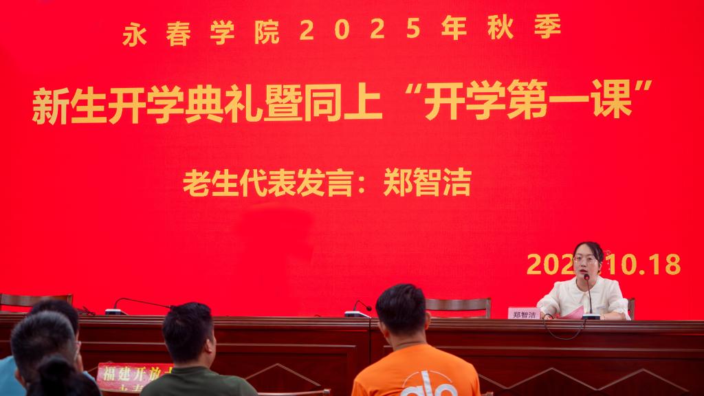 永春学院2024年秋季本科1班班长、永春县司法局湖洋司法所所长郑智洁以老生代表身份发言。虽已取得硕士学位,她为提升法学专业能力、更好适配基层司法工作,2024年选择就读永春学院。她向新同学分享了自己在永春学院一年半期间,在院长与教师的悉心指导下,不仅夯实专业知识、填补实践短板,还依托学院多元平台成长,先后获评永春县“学法标兵”、永春学院优秀学生干部,其作品亦获永春学院“书香校园”书评大赛一等奖。她勉励新生,永春学院是学知识、学处世的沃土,希望大家珍惜时光,刻苦钻研专业、练就过硬本领,在提升自我的同时为学院争光,早日实现“今天我以永春学院为荣,明天永春学院以我为傲”的目标。