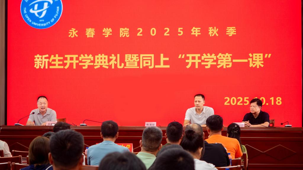 10月18日上午,福建开放大学举办2025年秋季新生开学典礼暨同上“开学第一课”。福建开放大学永春学院在县教育中心六楼会议室设分会场,同步收看直播并举办开学典礼。永春县教育局局长陈涌湖、三级调研员李锦江出席活动,学院全体教职工以及2025年秋季新生代表共同参加。永春学院院长吕朝晖主持分会场活动。