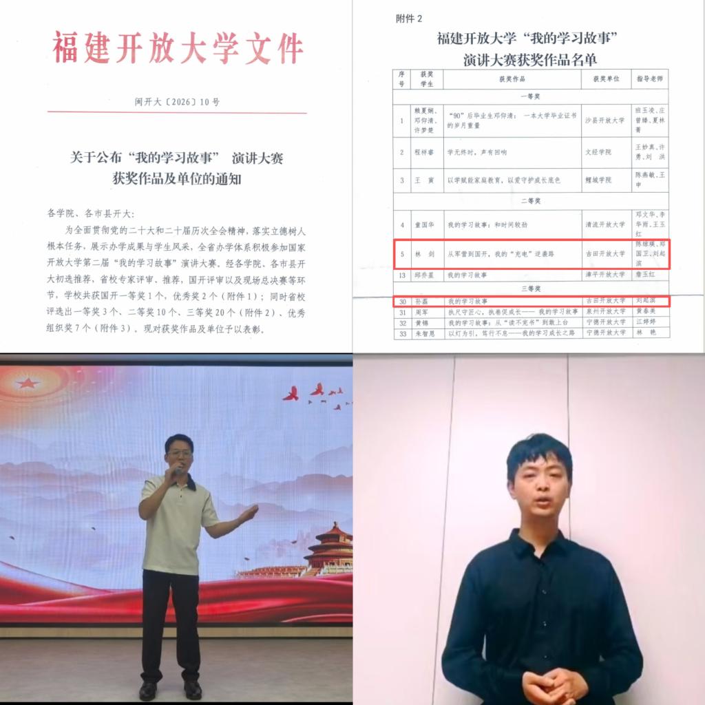 近日,福建开放大学公布第二届“我的学习故事”演讲大赛获奖名单,古田开放大学学子凭借扎实功底与真挚表达脱颖而出。在陈琼瑛、郑国卫、刘起滨等教师精心指导下,林剑同学的《从军营到国开,我的“充电”逆袭路》荣获二等奖,孙磊同学的《我的学习故事》获评三等奖,为母校争得了荣誉。