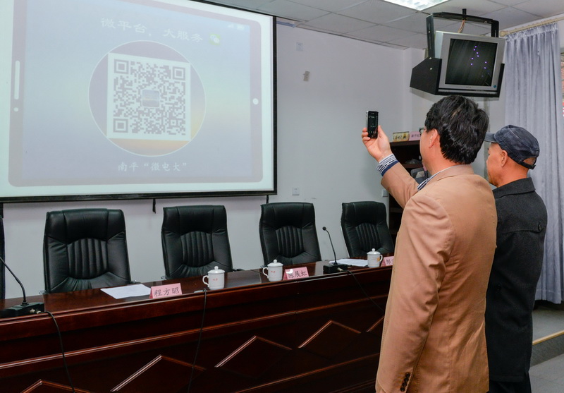 陈展虹和邹义榕用手机扫描南平“微电大”二维码,标志着南平“微电大”微信云平台正式开通。与会人员通过手机扫描二维码,进入“微电大”,体验“微学习”、“微生活”等各项互动功能。