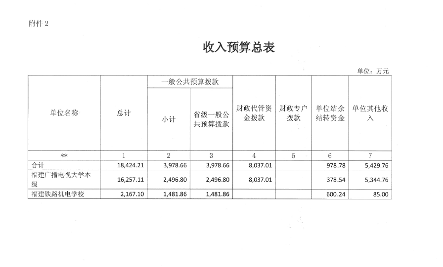 按照预算管理有关规定,目前福建广播电视大学预算的编制实行综合预算制度,全部收入和支出都反映在预算中。2017年福建广播电视大学收入预算为18424.21万元,其中:一般公共预算拨款3978.66万元,基金预算财政拨款0万元,财政专户拨款0万元,财政代管资金拨款8037.01万元,单位其他收入5429.76万元,单位结余结转资金978.78万元。相应安排支出预算18424.21万元,其中:人员支出7559.3万元,对个人和家庭补助支出834.59万元(不含退休人员基本退休费和生活补贴),公用支出929.53万元,项目支出9100.79万元。