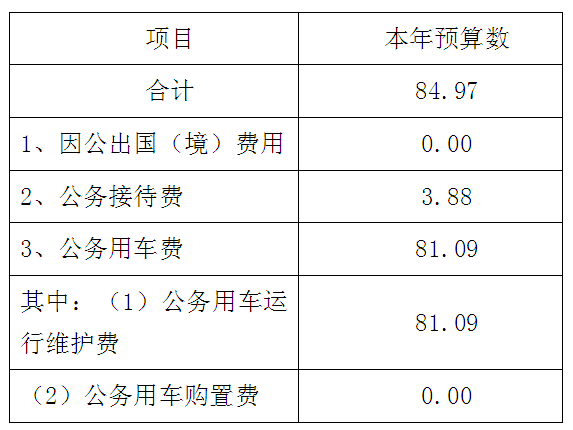 2015年“三公”经费公共财政拨款预算数为84.97万元,其中:因公出国(境)经费 0万元,公务接待费3.88万元,公务用车购置及运行费81.09万元(购置经费0万元,运行经费81.09万)。具体情况如下: