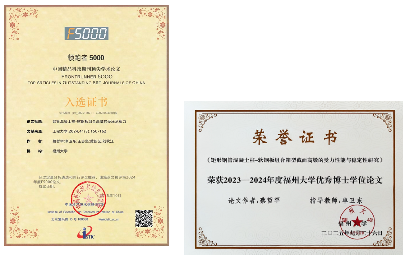 近日,国家科技部中国科学技术信息研究所发布2025年度“领跑者5000——中国精品科技期刊顶尖学术论文(F5000)名单”,我校引进博士蔡哲罕老师发表于中国卓越期刊《工程力学》的论文《钢管混凝土柱-软钢板组合高墩的受压承载力》成功入选。此外,蔡哲罕老师的博士毕业论文《矩形钢管混凝土柱-软钢板组合箱型截面高墩的受力性能与稳定性研究》,凭借深厚的理论基础与创新的研究视角,获评福州大学优秀博士学位论文。