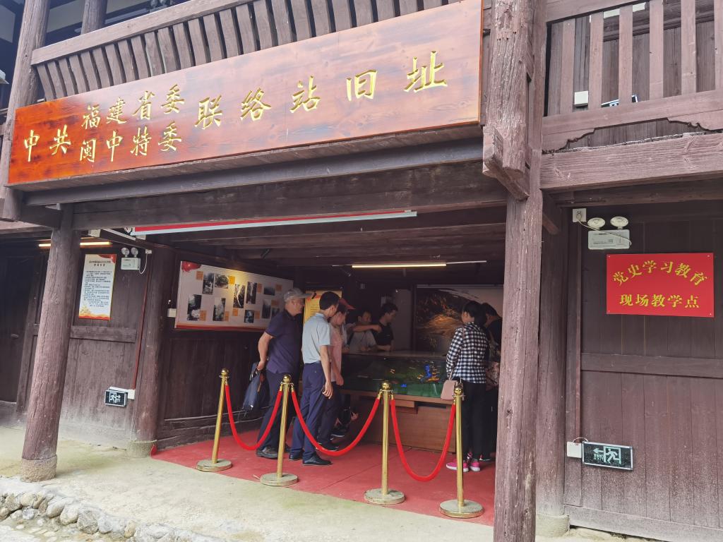 深山老林中的赤水村是当年闽中游击队活动的地方,是革命老区基点村。抗战期间,闽赣省委在境内建立革命根据地,赤水村村民为民族独立和解放事业作出了贡献和牺牲,也因此有了一抹慷慨激昂的红色。在“闽中特委联络站旧址”前,全体党员驻足瞻仰,细听着镇群工干事张同志关于闽中特委在当地村民黄声烟家里建立秘密联络站,发展地下联络网点等英雄事迹的介绍,随后由党支部书记杨聪颖现场组织学习了《论中国共产党历史》的编辑背景和基本内容。“学史明志、崇德力行”,全体人员表示要传承和发扬八闽儿女的红色精神,爱岗敬业,勇于担当、敢于作为,为以实际行动做好福建开放大学的非学历教育培训管理工作,为提升职业技能型人才培养质量和学校事业发展不懈奋斗。