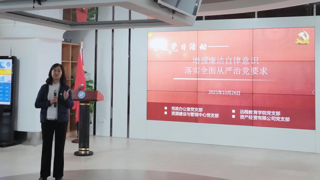 为深入贯彻落实全面从严治党要求,进一步增强支部党员廉洁自律意识和保密意识,筑牢拒腐防变底线,10月26日下午,党政办公室党支部、远程教育学院党支部、资源建设与管理中心党支部、资产经营有限公司党支部在廉政文化活动中心联合开展了以“增强廉洁自律意识 落实全面从严治党要求”为主题的党日活动。校纪委副书记、纪检监察室主任薛峰莅临现场指导。四个支部的全体党员、入党积极分子参加活动,活动由党政办公室党支部组织委员、纪检委员林卫民主持。