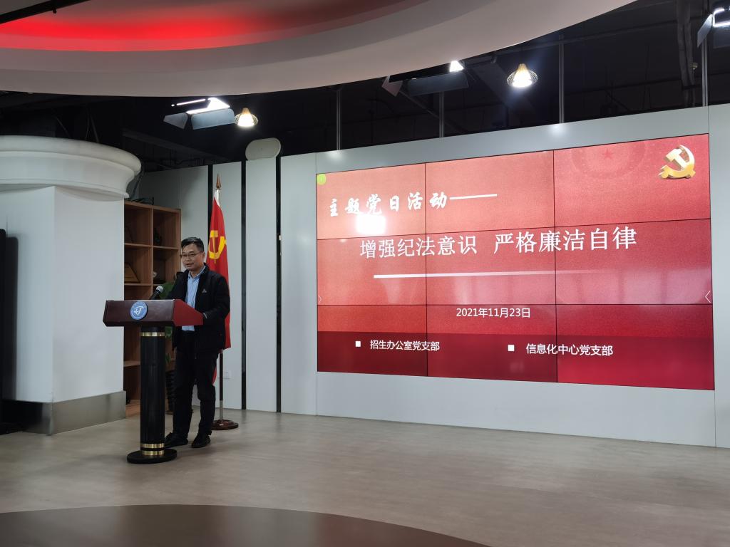 为贯彻落实全面从严治党要求,进一步增强党员干部廉洁自律意识,11月23日下午,招生办公室党支部与信息化中心党支部联合开展“增强纪法意识 严格廉洁自律”主题党日活动。两个支部全体党员及部分教职工参加学习,活动由招生办公室党支部书记黄健新主持。