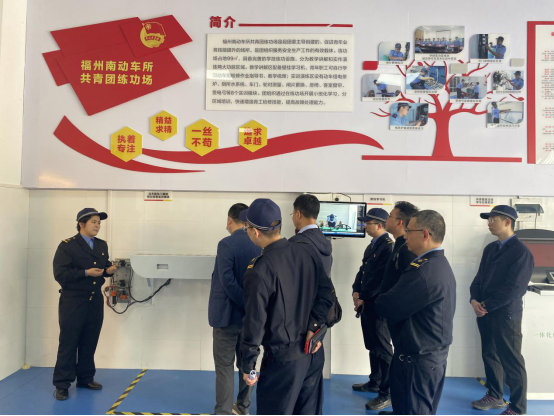 在动车段几位工程师的带领下,学院团委及机械工程系党支部先是参观了创新青仝工作室,工作室由“修旧联盟”“攻关大人”“漏洞消消乐”“动漫火车”等专业团队组成,是动车段青年职工队伍的中坚力量。在共青团练功场内,练习用的机械设备一应俱全,同时还搭配各种教学视频,让学员自主学习。模拟驾驶中心同样引人注目,通过拟真技术,学员能够身临其境的驾驶动车,最大限度锻炼实操技术。