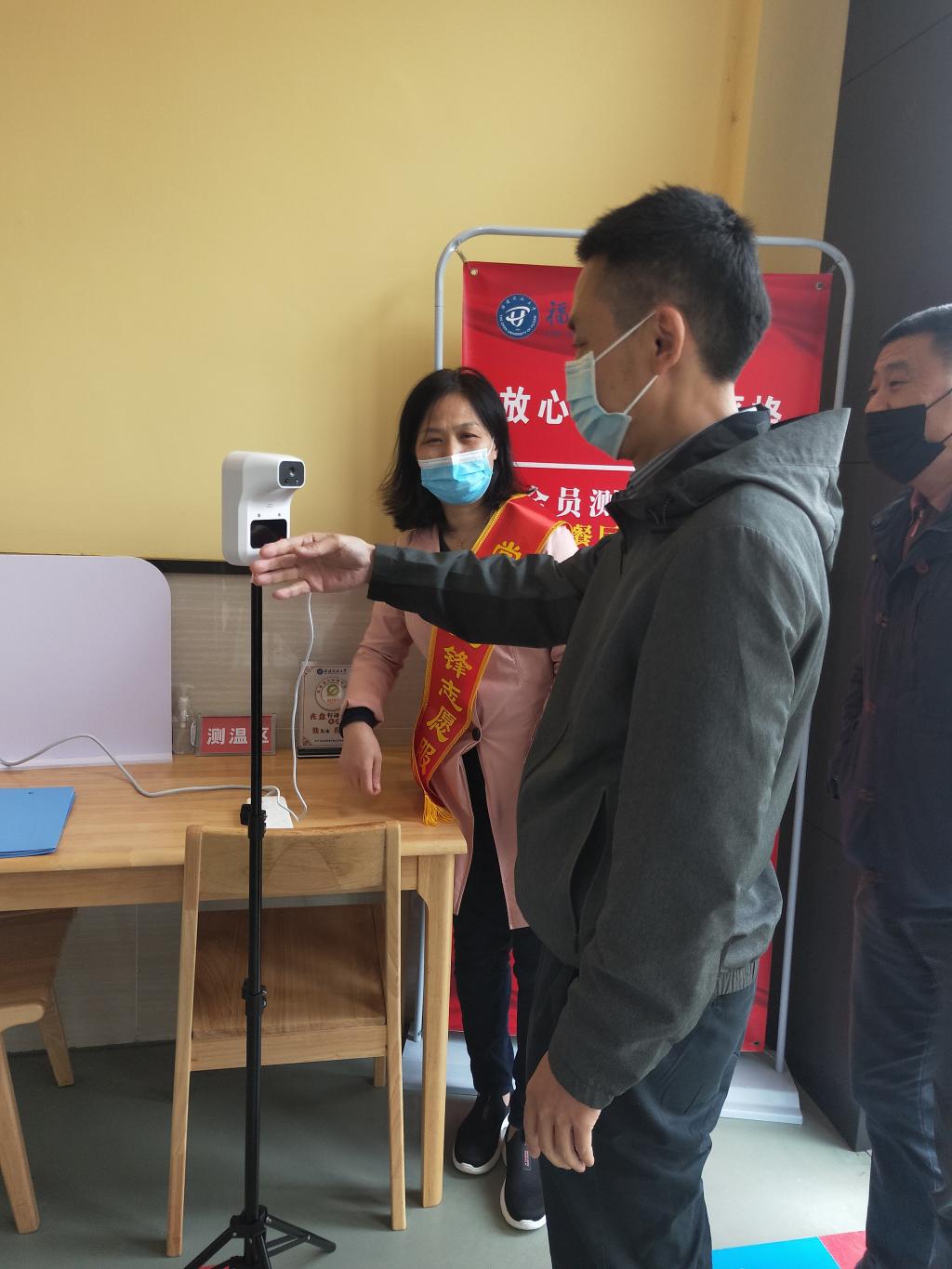 党员志愿者引导用餐教职工测温