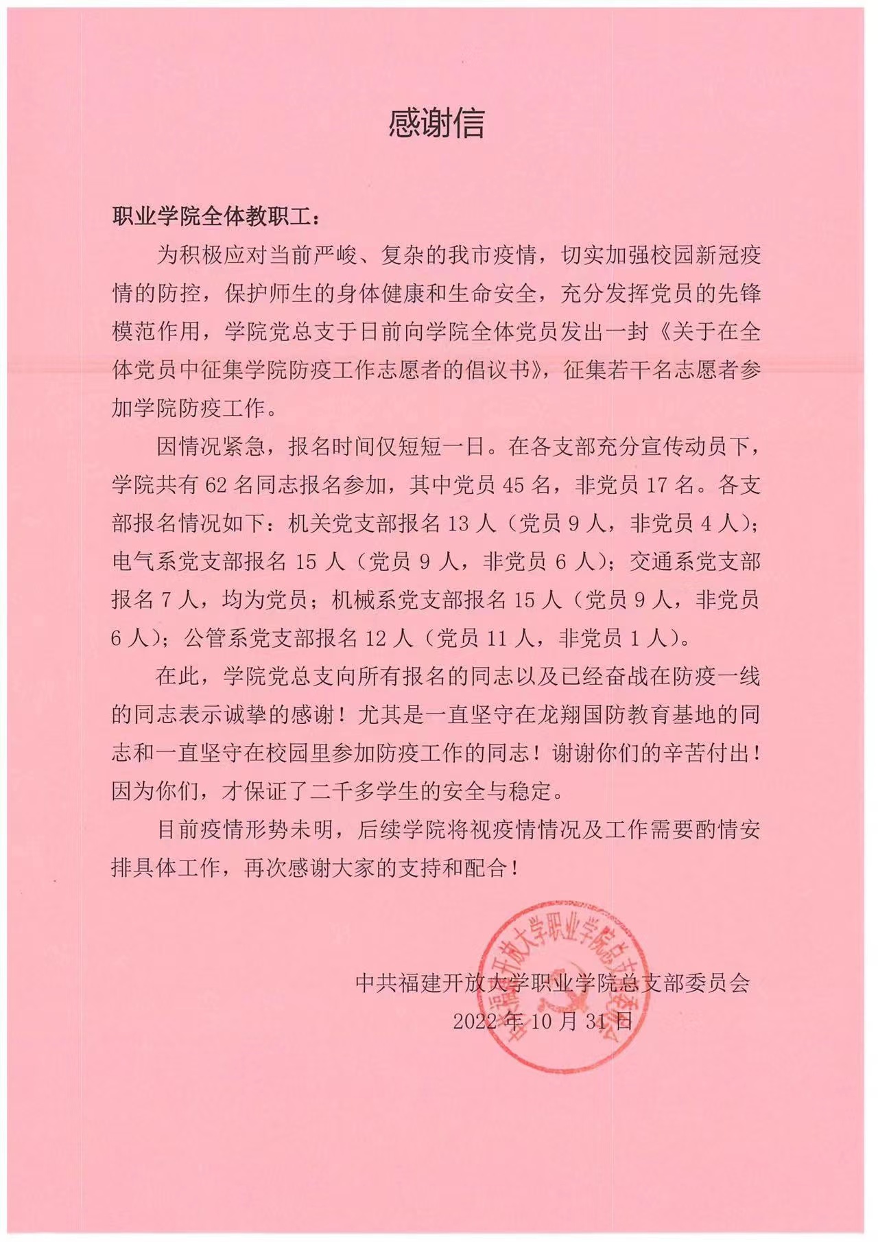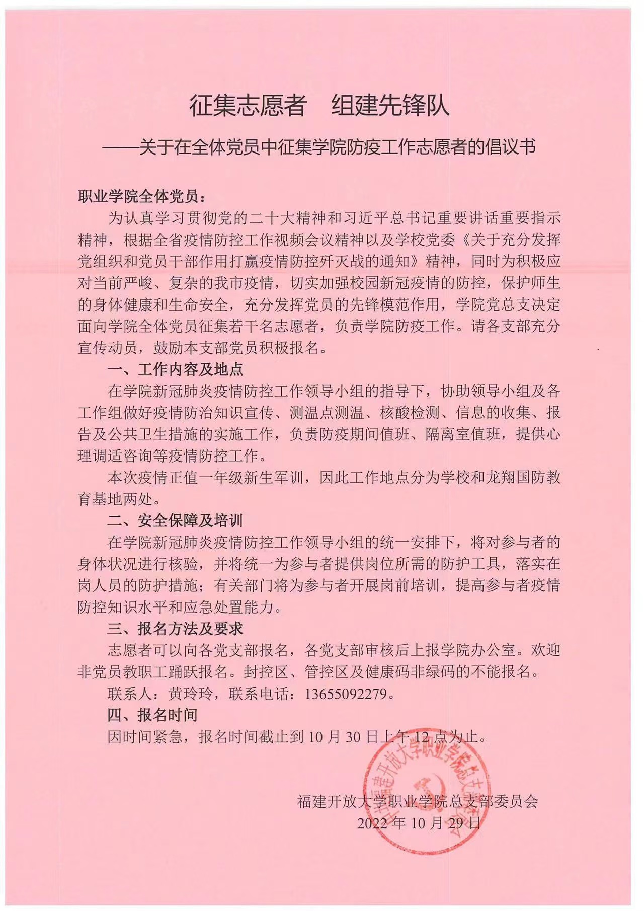 为积极应对福州市当前严峻、复杂的疫情,切实加强校园新冠疫情的防控,保护师生的身体健康和生命安全,充分发挥党员的先锋模范作用,10月29日,职业学院党总支面向五个党支部和全体党员发出《关于在全体党员中征集学院防疫工作志愿者的倡议书》,吹响战疫“集结号”,号召党支部构筑疫情防控的“红色堡垒”,在防疫一线检验基层党组织的组织力、战斗力和凝聚力。