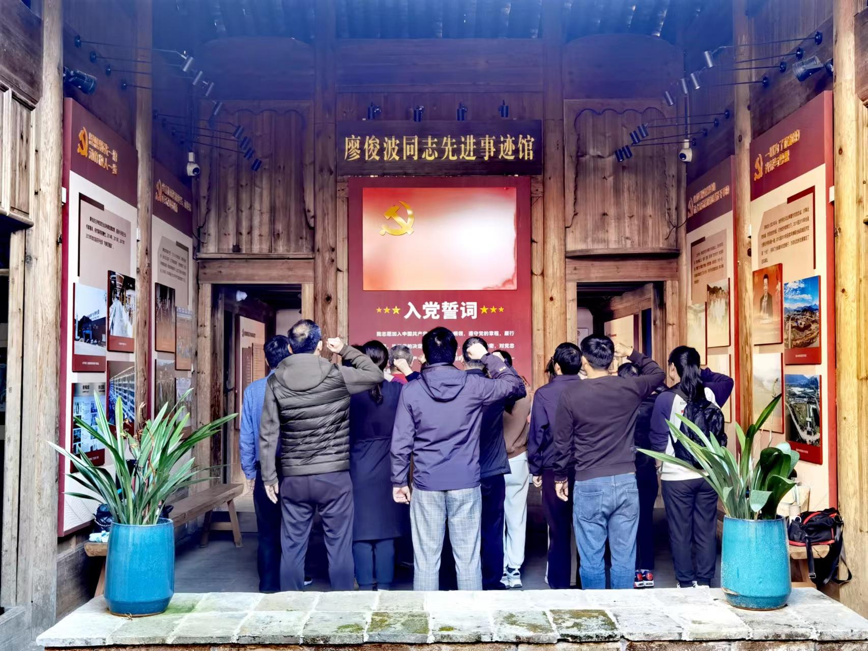 本次立项现场教学活动包含参观学习和重温入党誓词两部分。在政和县党校老师的带领下,党员们参观了廖俊波先进事迹展示馆,以时间为脉络深入学习廖俊波同志生平事迹,通过观看短视频、图片和文字资料等形式,深切体会廖俊波同志一心为民的奉献精神,引导教育党员们恪守务实清廉、担当忠诚干净。在参观完石圳村廖俊波先进事迹馆后,由两位党支部书记带领全体党员面向党旗重温入党誓词,坚定党员们的入党初心,再次许下作为一个共产党员的诺言。
