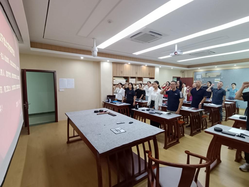 开展教师誓词宣誓。学院全体教师在王妙真的带领下,进行了庄严的誓词宣誓,许下对教育事业的坚定承诺。大家还集体参观了学院新打造的廉洁文化阵地“青莲书屋”,了解了书屋的主题定位和功能布局,并在书屋进行了合影。