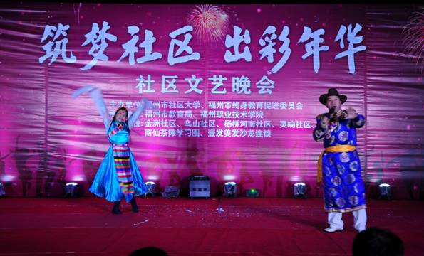 12月9日晚,福州市社区大学在福州市仓山榕城广场举办主题为“筑梦社区·出彩年华”的大型社区文艺晚会。晚会由福州市社区大学和福州市终身促进委员会联合主办,福州市教育局、福州职业技术学院承办,金洲社区、乌山社区、南仙茶摊学习圈等单位协办。