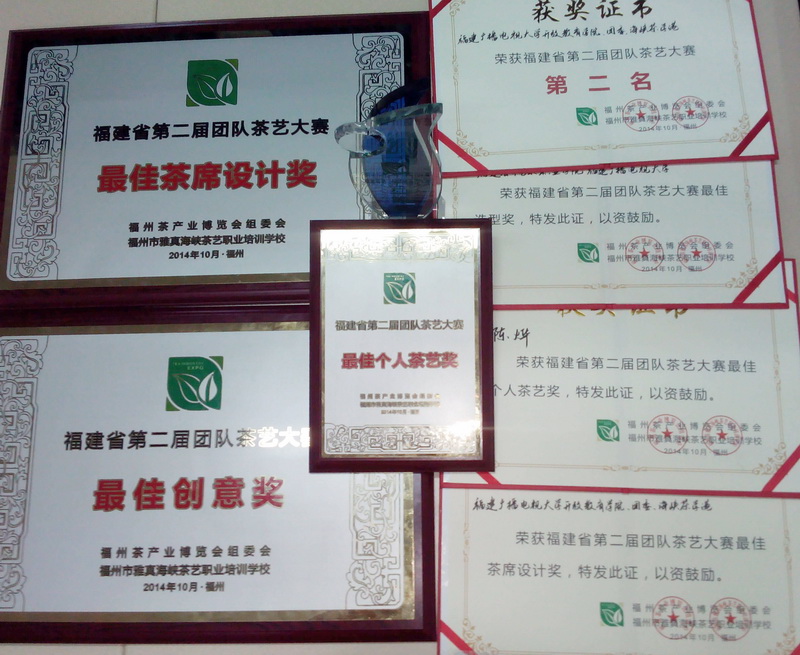 2014年第二届福州茶产业博览会暨福建省第二届团队茶艺大赛于10月30日在福州海峡会展中心举行,我校茶文化艺术表演队代表学校参加比赛,并以出色的表演获团队茶艺大赛第二名(二等奖)、最佳创意奖、最佳茶席设计奖,学生陈烨获得最佳个人茶艺奖。