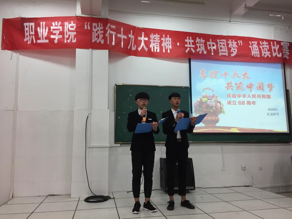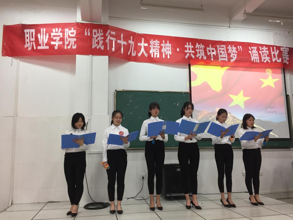 为了学习贯彻党的十九大精神,让习近平新时代中国特色社会主义思想在广大青年学生中落地生根,由职业学院团委主办,中高职学生会学习部联合承办的“践行党的十九大精神 共筑中国梦”诵读比赛于12月14日晚18:30在新阶梯教室隆重举行。