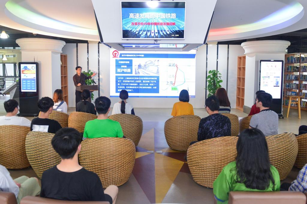 5月16日下午,经过精心准备,“高速发展的中国铁路”主题活动在数字图书馆启动。五老人员、关工委常务副主任肖朝福以一名老铁路人的视角向大家讲述了中国铁路发展史:从旧中国铁路状况到新中国铁路建设,从简陋的绿皮火车到先进的流线型动车,从普通有缝钢轨到高速无缝钢轨,从蜿蜒曲折速度受限的常规铁路到逢山钻洞逢涧架桥的高速铁路……中国铁路人突破了重重困难,攻克了一道道技术难关,创造了一个个奇迹,使中国成为世界高速铁路商业运营速度最快的国家。他用详实的资料和亲身经历,与学生进行交流、对话,引导学生感悟新中国成立以来,特别是改革开放以来中国铁路翻天覆地的变化。