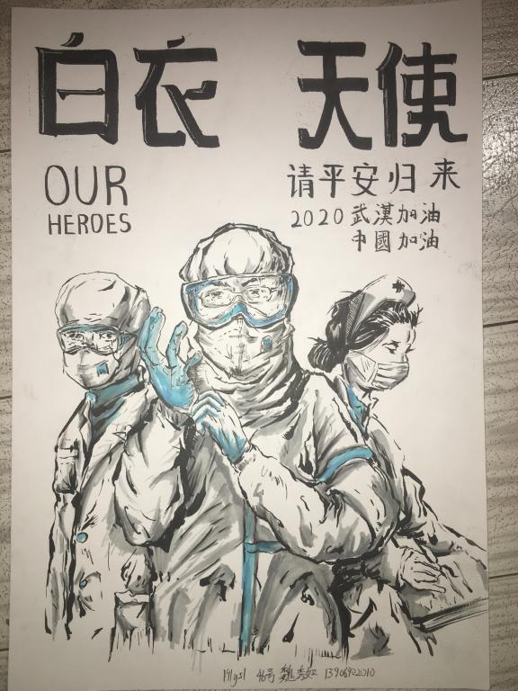 本次参赛作品包括书法、绘画、电子海报三大项。活动受到了同学们的热切关注,截止5月5日下午17:00,共收集参赛作品40件。同学们满怀激情,用心勾画每一缕线条,认真写下每一个汉字。宣传画中的援鄂医者形象体现了同学们“抗击疫情,为中国加油”的满腔热情,书法作品中的一撇一捺都体现着中国学生在党的培养下茁壮成长的良好精神面貌。