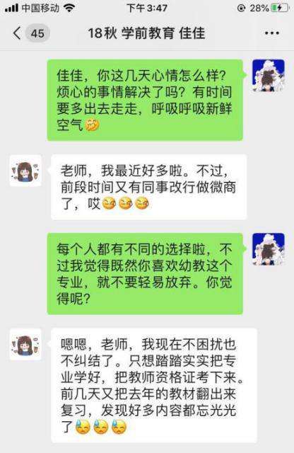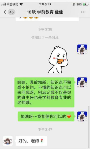 “佳佳,这几天心情好点了吗?”“亲,要加油哦!”这是疫情期间班主任李玲玉的工作日常。她所带的学前教育专科班有半数学生是民办幼儿园教师。受疫情影响,幼儿园迟迟未能复工复课,这让当初执意选择幼教事业的刘佳佳心里打起了退堂鼓。班主任李玲玉了解到这一情况之后,耐心地向她分析幼教行业的前景,鼓励她克服暂时的困难,追寻心中的幼教梦。同时,李玲玉还鼓励学生利用这个超长假期充实自己,练好技能,为即将到来的复学复课做好准备。