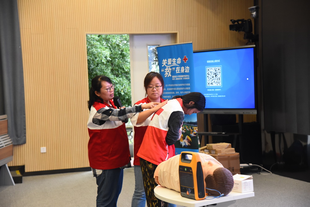 培训现场,省红十字会救护师资刘丽琴老师就现场心肺复苏术及气道异物梗塞现场急救、自动体外除颤器(AED)的使用方法,常见急症、意外伤害、突发事件的处置等内容,以互动的形式进行了现场讲解;参训学员在老师的指导下,现场操作了人工呼吸和心肺复苏的操作方法,以及成人和婴幼儿气道异物梗阻处理的技能演练。省红十字会现场应急救护中心还发放了安全救护手册,使“人人学急救、急救为人人”的生命健康教育理念在校园内进一步得到宣传推广。