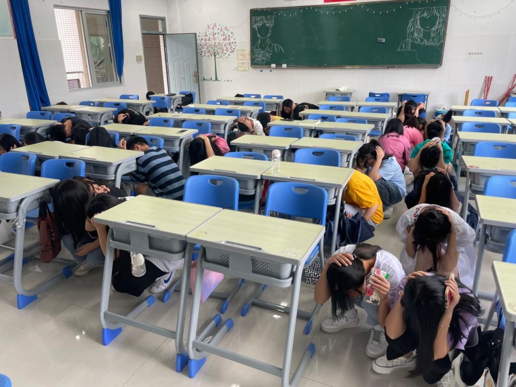 演练模拟教学楼区域发生强烈地震,保卫科通过校园广播通知所有师生就近紧急避险。师生在听到广播后,采取就近蹲于桌下或承重墙角、用书或书包保护头部、蜷曲身体等方式紧急避险。广播发布疏散信号后,班主任迅速组织学生按照疏散路线离开教室到广场集合,并清点人数。