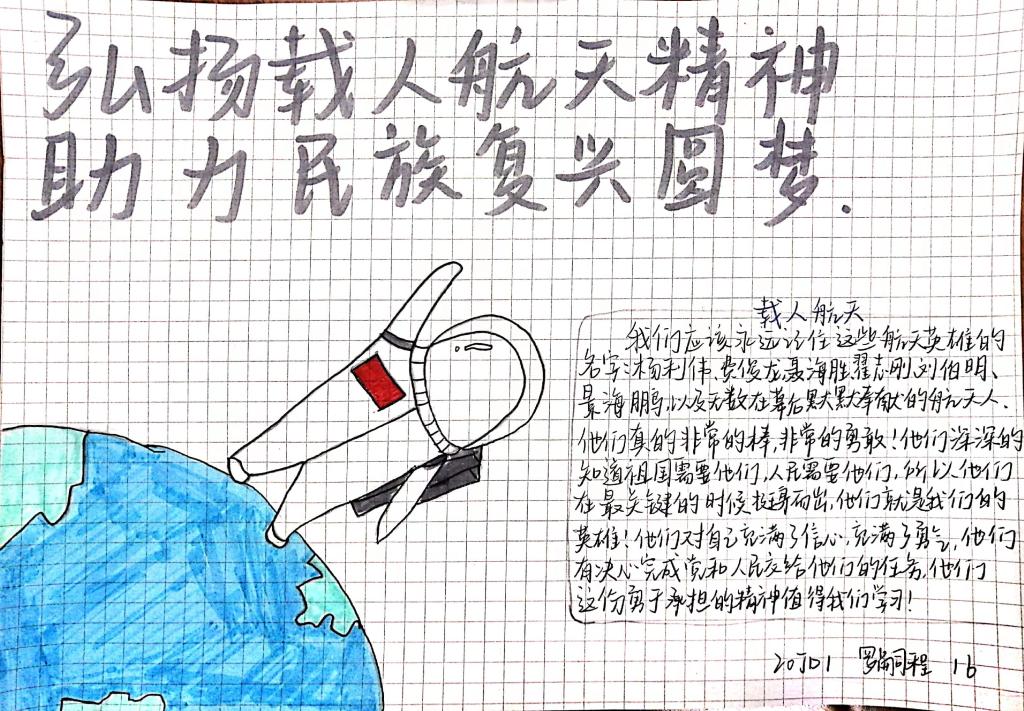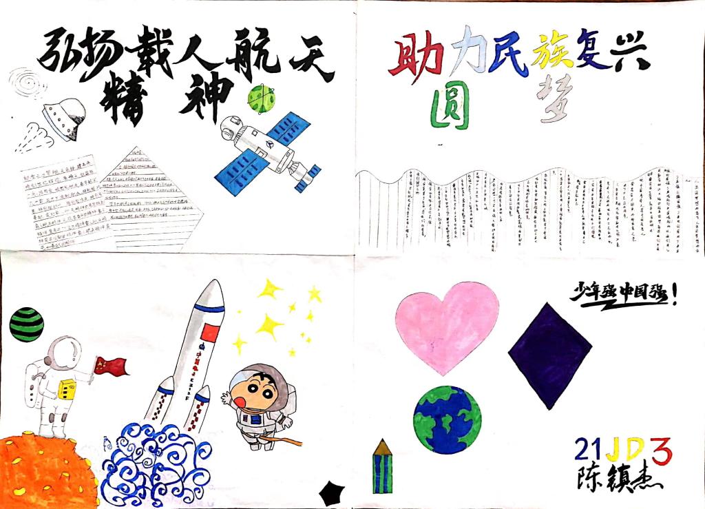 4月17日,系部学生会干部面向全体同学征集航天主题手抄报,各班级同学踊跃参与,纷纷报名,在海报纸上绘画作图,将心中的航天梦、太空梦一笔一画细细勾勒。海报纸的边界有限,科技的力量却是无穷,同学们创作了一幅幅“航天梦”的绘画作品,致敬宇航员,立下少年志,用自己小小的力量助力航天梦、中国梦!