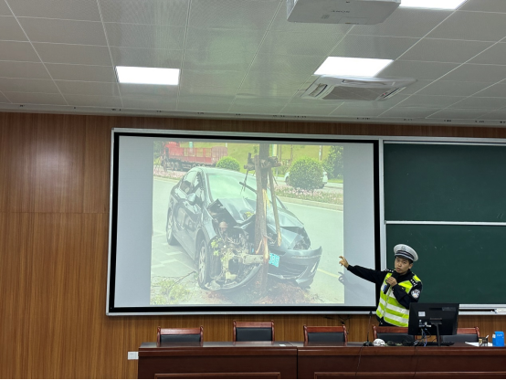 在宣讲现场,肖涛警官结合案例,向学生讲授了交通事故的主要特点与几种常见违法行为的危害,全面剖析事故发生的原因,提醒同学们严格遵守交通法律法规,严禁超载、驾乘电动车需戴好安全头盔。肖涛警官强调,交通安全关乎生命,珍爱生命从安全出行做起,良好的交通秩序需要大家共同来创造。