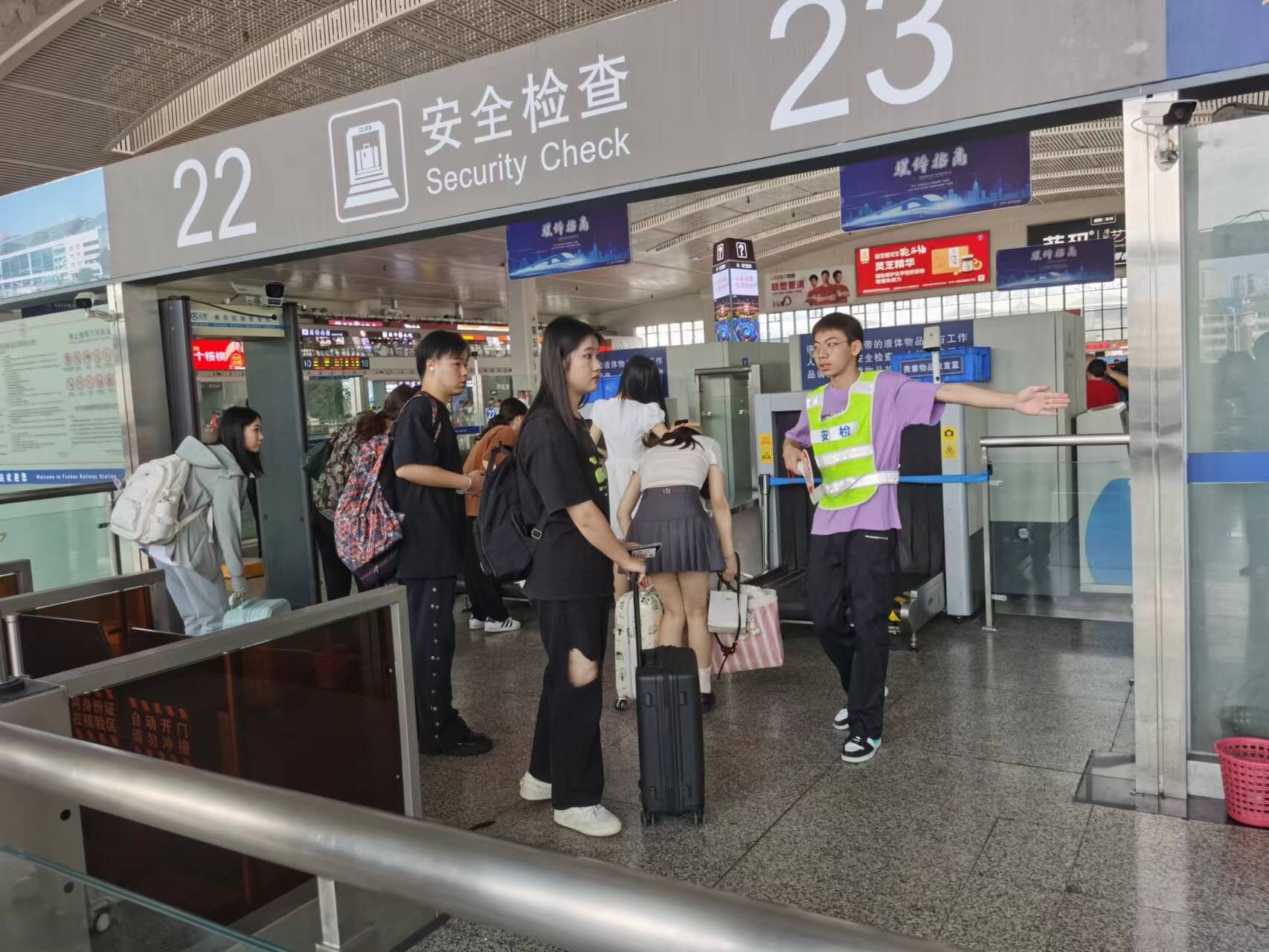 为全力保障中秋、国庆期间福州站、福州南站旅客安全出行,同时提升学生的社会参与能力、培养学生社会责任感,应铁路部门请求,我校职业学院交通工程系组织系部150名学生积极参与福州车站(二次)安检志愿活动。本次车站志愿服务时间为9月26日至10月8日,共计13天。系部班主任陈纪威和陈小芳担任带队老师,分别带领志愿者们到福州站和福州南站进站口协助车站开展安检服务。