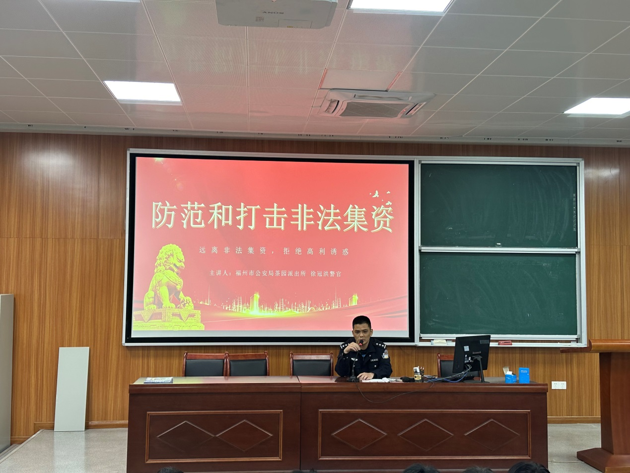 讲座过程中,徐冠洪警官详细阐述了非法集资的定义、特征及其所带来的社会危害。他结合一系列真实案例,对非法集资的运作模式和识别方法进行了深入剖析,使同学们对非法集资有了更加直观和深刻的认识。徐警官还强调了防范非法集资的重要性,提醒同学们在日常生活中要增强风险意识,不盲目相信造势宣传,不参与非法集资活动,并积极举报非法集资违法犯罪行为,以维护自身合法权益。