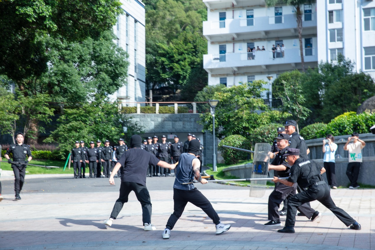 此次演练活动主要包括两大科目内容:应急机动分队防暴操展示以及突发事件应急模拟案件处置。首先,由学生组成的应急机动分队展示了人墙抵御战术、盾棍实战对抗以及应对突发事件时的整体阵型攻防变化,战术清晰、气势高昂,充分展现了应急分队严明的纪律和出色的团队协作精神。