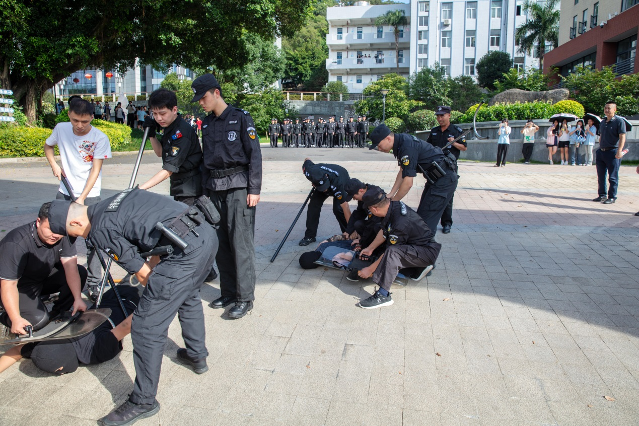 接着,第二科目模拟了学生在出校门时突遇持刀歹徒追击,并企图闯入校园的紧急情况。校园教师与安保人员迅速响应,合力将企图进入校园的歹徒制伏。演练中,安保人员在发现突发情况后,立即通知学校并报警,教师迅速赶到现场,与保安一同使用器械与持刀歹徒对峙,有效拖延了时间,直至特警和辖区派出所民警到达现场并成功控制“暴恐分子”。整个演练过程紧张有序,取得了预期效果。