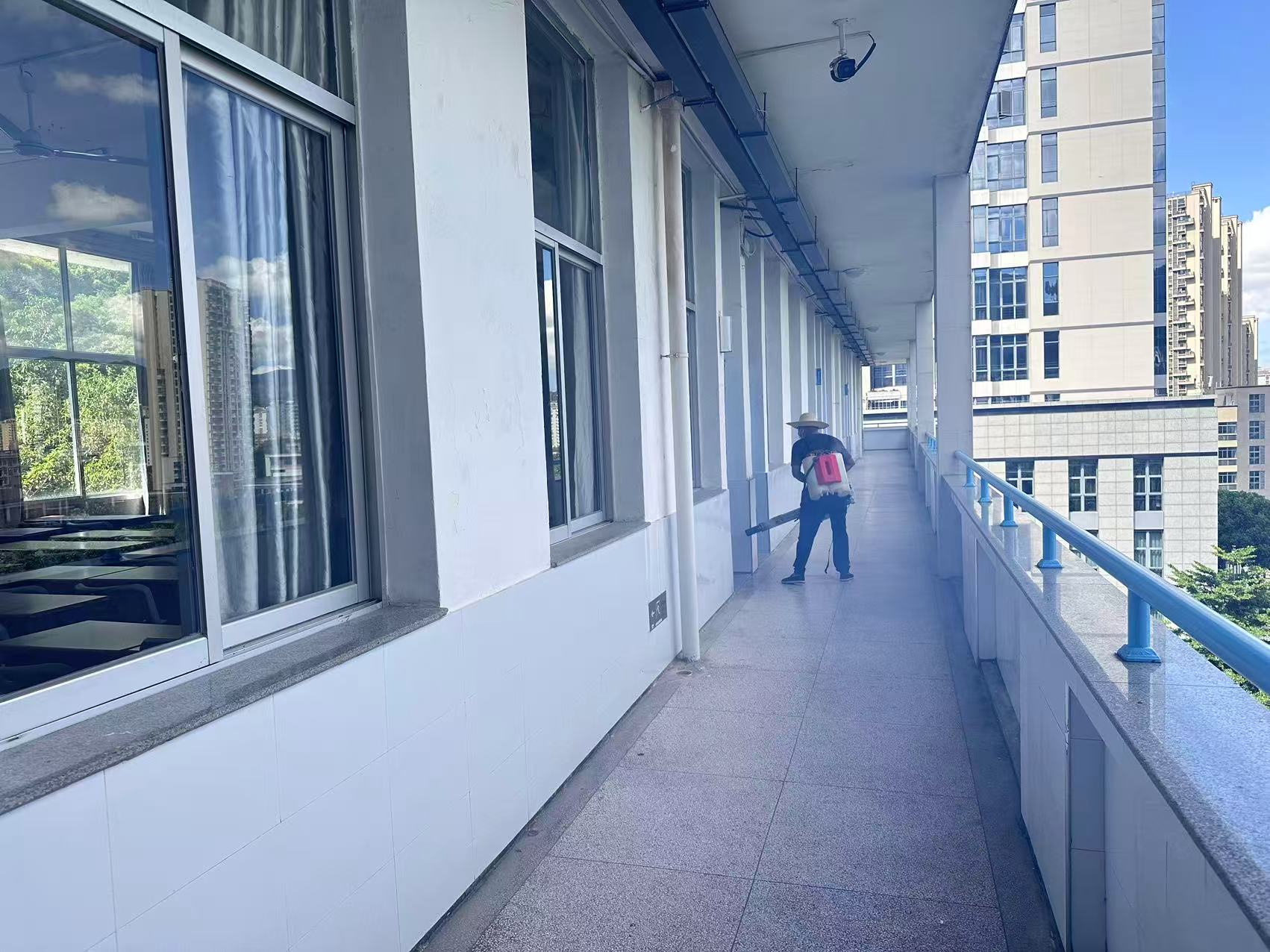 经提前部署、周密安排。消杀行动严格遵循卫生防疫规范,由专业人员全程操作执行,选用符合国家环保与安全标准的低毒高效卫生杀虫药剂,重点对教学楼、实训车间、宿舍楼道等室内场所等蚊虫易滋生区域,精准标注消杀点位,确保消杀工作无遗漏、无死角。消杀过程使用超低容量喷雾器对墙面、墙角、窗台等蚊虫栖息处进行精准喷洒,在阻断蚊虫繁殖链的同时避免环境污染。工作人员在消杀工作中同步开展环境清洁,及时清理枯枝落叶、积水杂物,从源头杜绝蚊虫滋生条件。