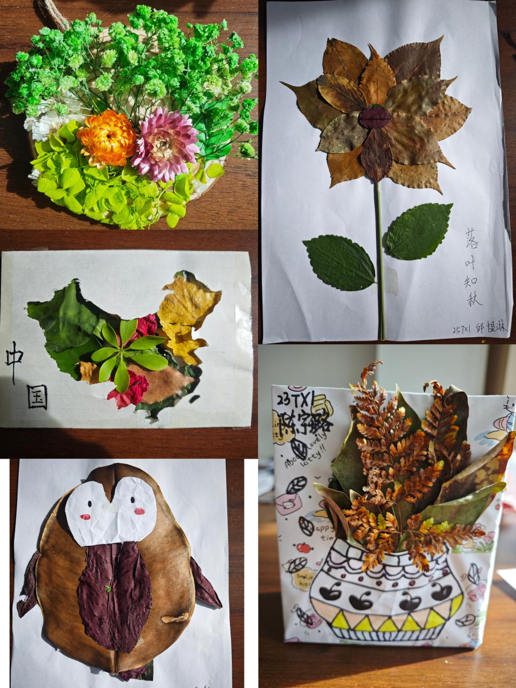 参赛作品主题丰富、形式多样,展现了同学们独特的审美视角与扎实的动手能力。有的作品以“秋日盛景”为主题,用银杏叶铺就秋日小径,用枫叶点缀层林尽染,还原了大自然的静谧与绚烂;有的作品传递环保理念,用落叶拼出企鹅、大树、蝴蝶等图案,呼吁大家守护自然、珍惜资源;更有同学大胆创新,将落叶与绘画、文字相结合,让作品兼具艺术感与思想性,每一幅作品都凝聚着同学们对自然的热爱、对生活的感悟。