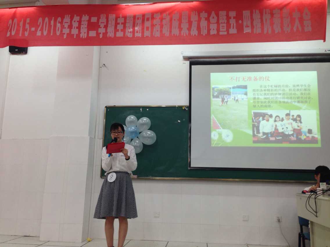 5月4日晚,职业学院2015—2016学年第二学期主题团日活动成果发布会暨五四推优表彰大会在新阶梯教室隆重召开。学院相关部门负责人应邀出席大会并担任比赛评委。