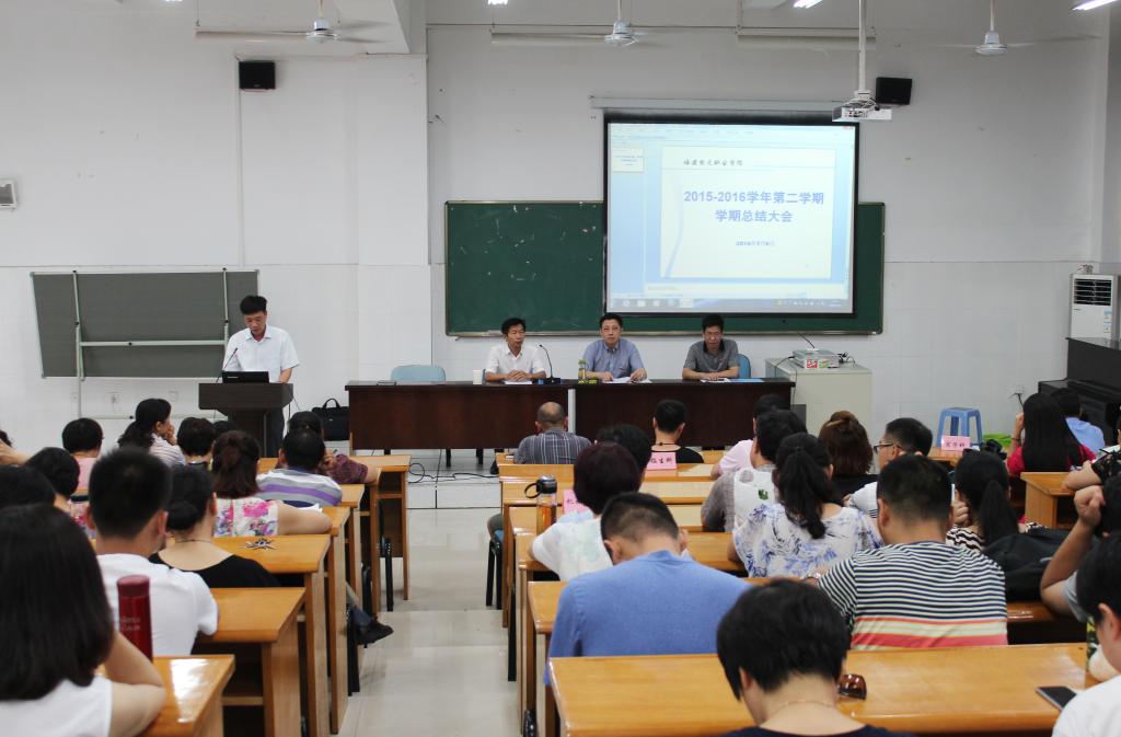 7月6日上午9点,电大职业学院全体教职工在博厚楼一楼阶梯教室召开2015-2016学年第二学期学期总结大会。会议由学院副院长颜宁德主持,各分管领导就自己所负责的科室工作进行了总结,对本学期的教育教学、后勤保障等工作予以肯定,对表现突出的同志予以表扬。