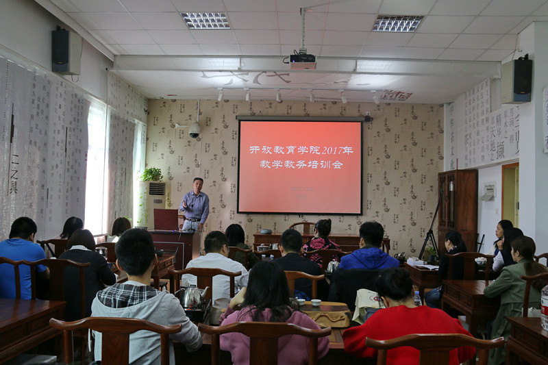 学校教务处学籍科的郭淑贞、考务科曾起域、教学管理中心毛高丽等老师分别对开放教育学籍管理及学位申请工作、考务管理相关业务工作、国开学习网平台管理等进行了系统培训。在场人员认真聆听讲解,并结合开放教育教学教务管理的细节与相关培训老师进行了讨论与交流。