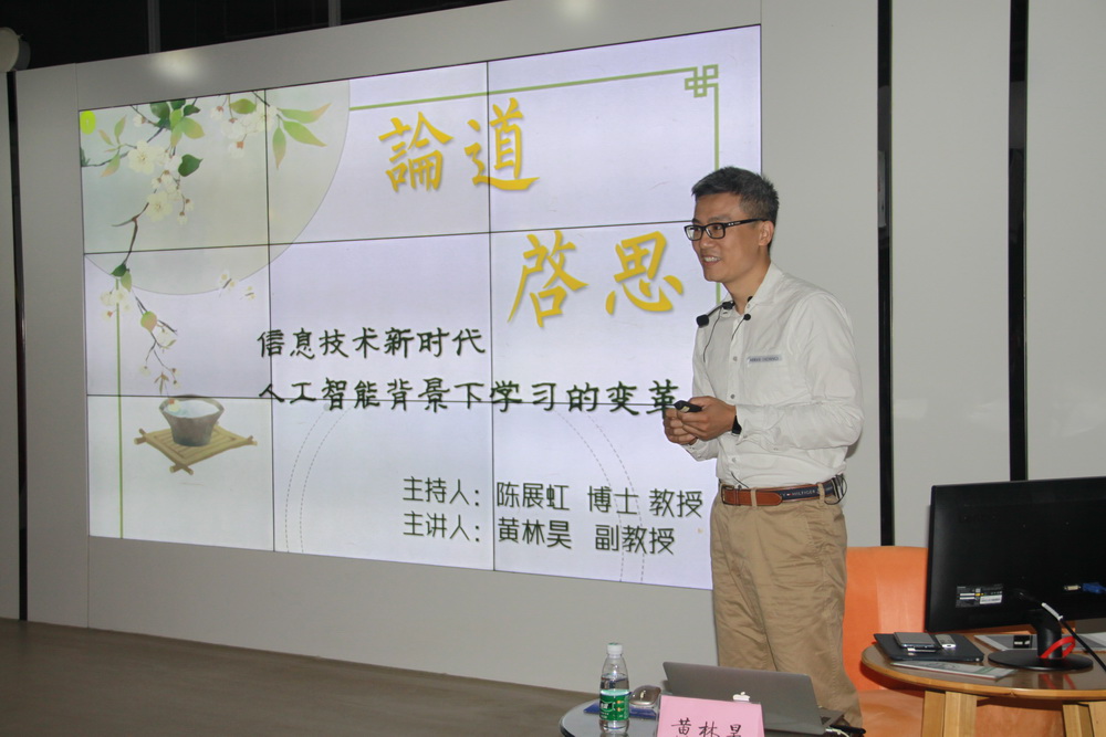 副教授黄林昊作主题为“信息技术新时代,人工智能背景下学习的变革”的新技术沙龙,就人工智能发展趋势、计算机算法、人工智能APP等方面和同学们进行了分享。到场师生认真聆听,现场互动环节,同学们就自己感兴趣的的问题向老师提问,氛围轻松活跃。