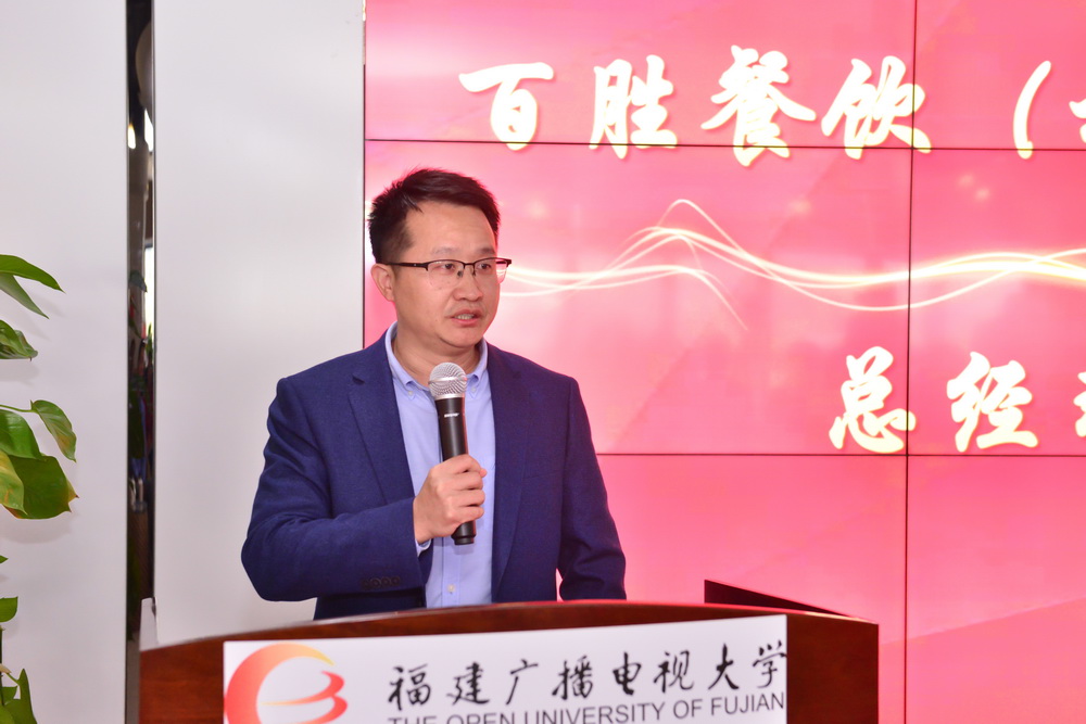 陈展虹向来宾介绍了学校建校近40年来的丰硕成果。他说,学校与百胜餐饮(福州)有限公司此次合作,是进一步深化产教融合,促进教育链、人才链与产业链、创新链有机衔接的重要尝试,是贯彻落实《关于深化产教融合的若干意见》的又一项重要措施,也是响应省教育厅、省总工会“农民工‘求学圆梦行动’计划”及福州市总工会“福州市职工‘求学圆梦’学历提升行动”的重要举措,为“再上新台阶、建设新福建”提供人力资源保障。他表示,下一阶段,学校将按照“适应需求、面向人人、有机衔接、多元立交”的思路,启动“百胜福州人才求学圆梦计划”,一是设立两个基地:在百胜设立“福建广播电视大学教学实践基地”,在学校设立“百胜餐饮(福州)有限公司连锁经营管理培训基地”,全面推动人才培养模式改革;二是打造一座立交桥:为百胜提供一体化的学历教育教学方案,将百胜的企业文化、需求融入专业教学计划,校企共同参与人才培养全过程,推动“专科、本科、硕士”有效衔接,打造人才成长“立交桥”;三是打通一条学分银行通道:依托“福建终身教育学分银行”,为参与学历教育学习和非学历教育培训的百胜学员建立终身学习档案,实现学习成果的认证、积累与转换。