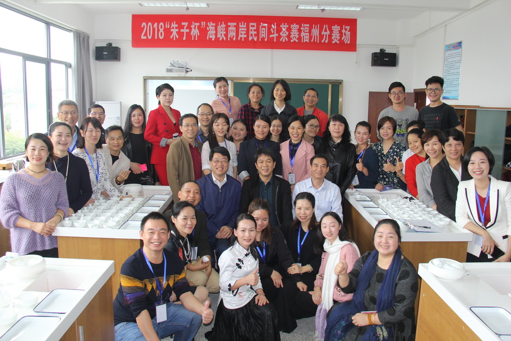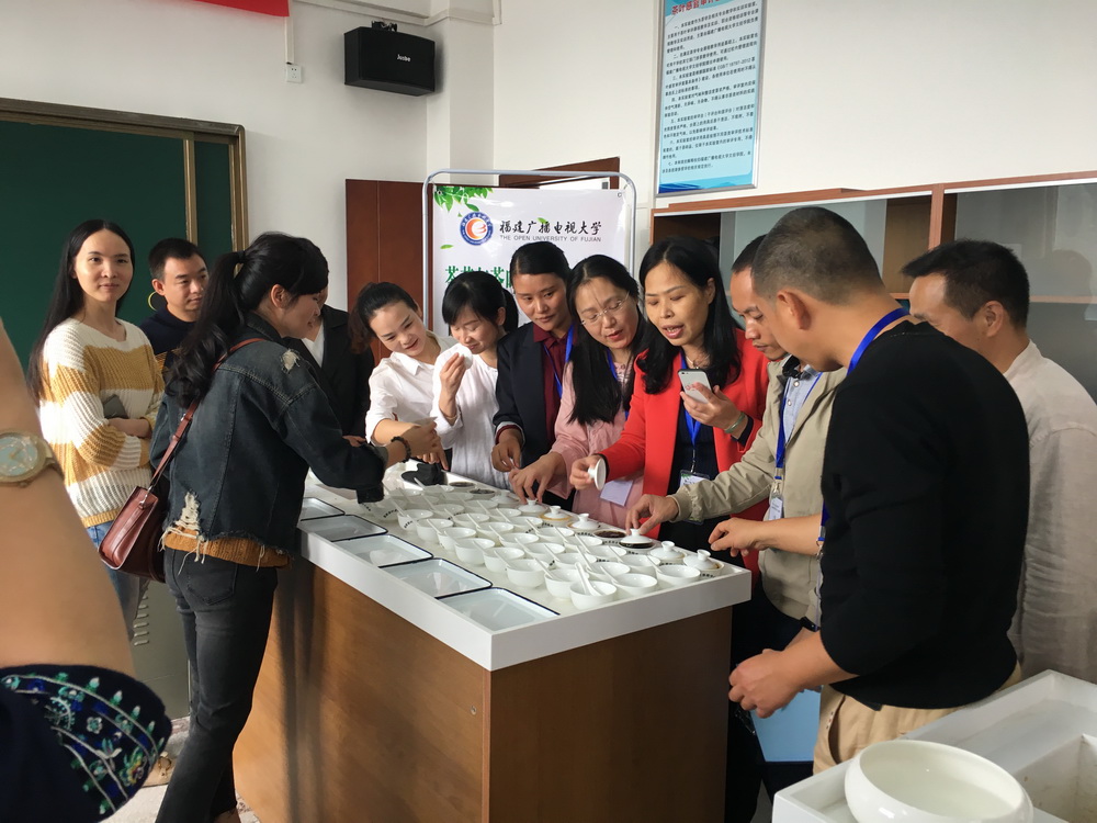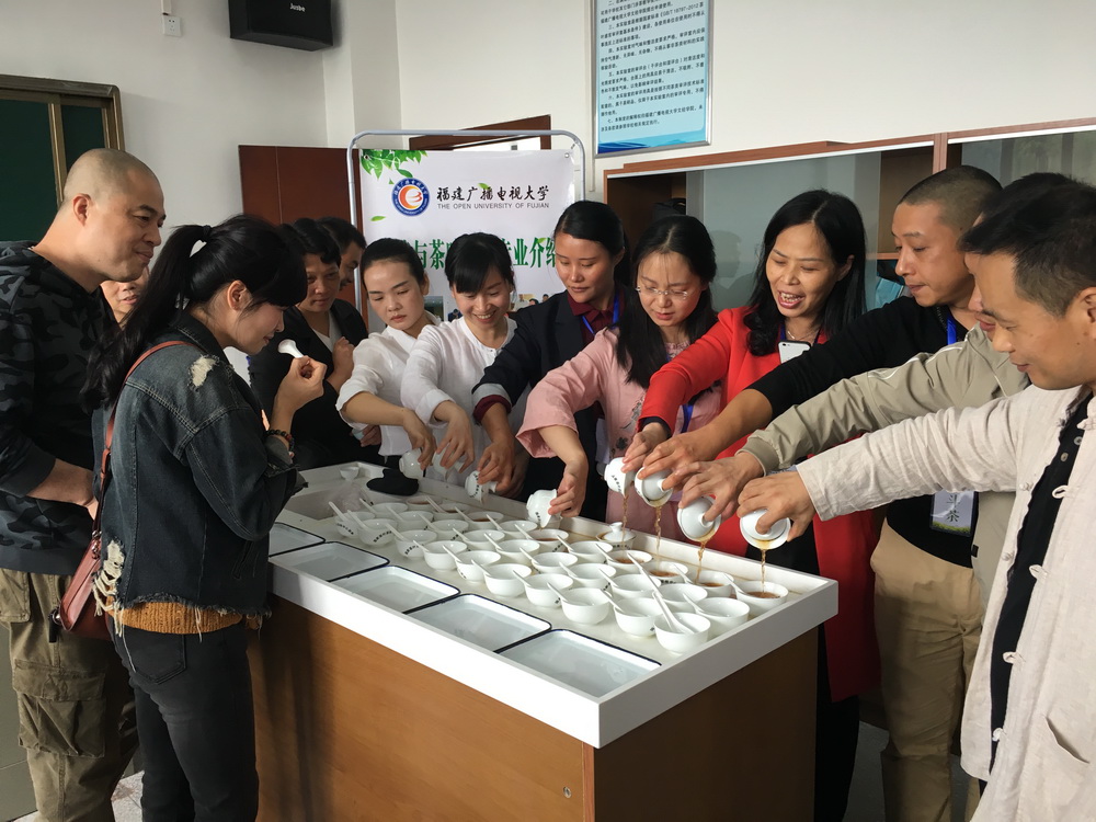 丹桂飘香时节,西湖之滨的福建电大茶叶审评实验室,茶香四溢、茶友云集。11月14至18日,2018第十二届海峡两岸茶业博览会的重要专项活动之一——“朱子杯”海峡两岸民间斗茶赛福州分赛场在我校左海校区举行。校长吴国荣,党委副书记马成斌,副校长陈展虹、沈光辉先后来到茶叶审评实验室,与文经学院师生以及来自社会各界的200多位茶友一起品茗论道,体验武夷斗茶盛事。在16日的直播活动中,陈展虹代表我校致辞。
