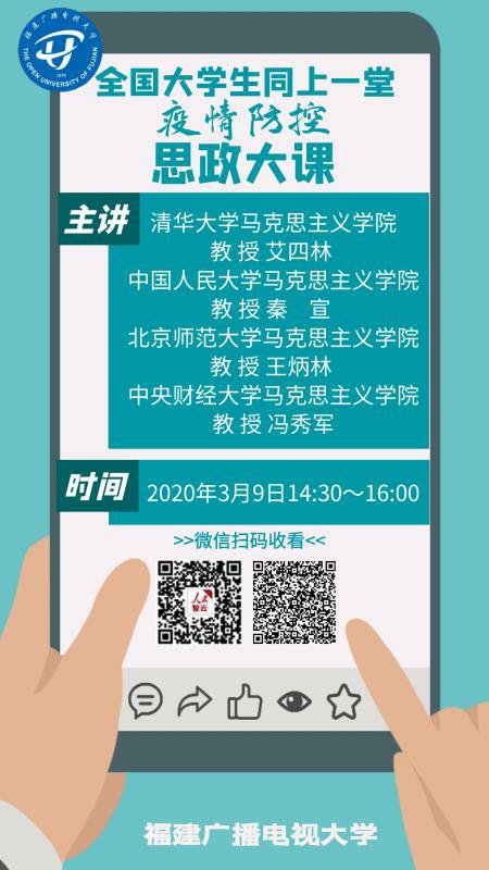 3月9日下午,教育部社科司与人民网联合组织了“全国大学生同上一堂疫情防控思政大课”,福建广播电视大学组织全省电大系统12.6万名学子通过不同直播平台共同观看了此次思政大课的直播。