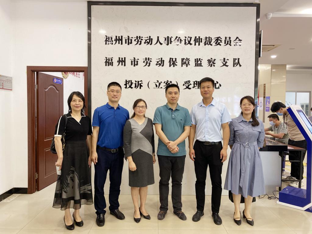 调研组一行实地参观考察了福州市劳动人事争议仲裁委员会投诉(立案)受理中心、福州市法律援助中心等地。座谈会上,唐虚谷介绍了福州市劳动人事争议仲裁院业务开展情况,及在新时代新业态下劳动仲裁工作的探索与创新。双方就推进学院、行业联合培养劳动关系专业人才进行了深入交流。