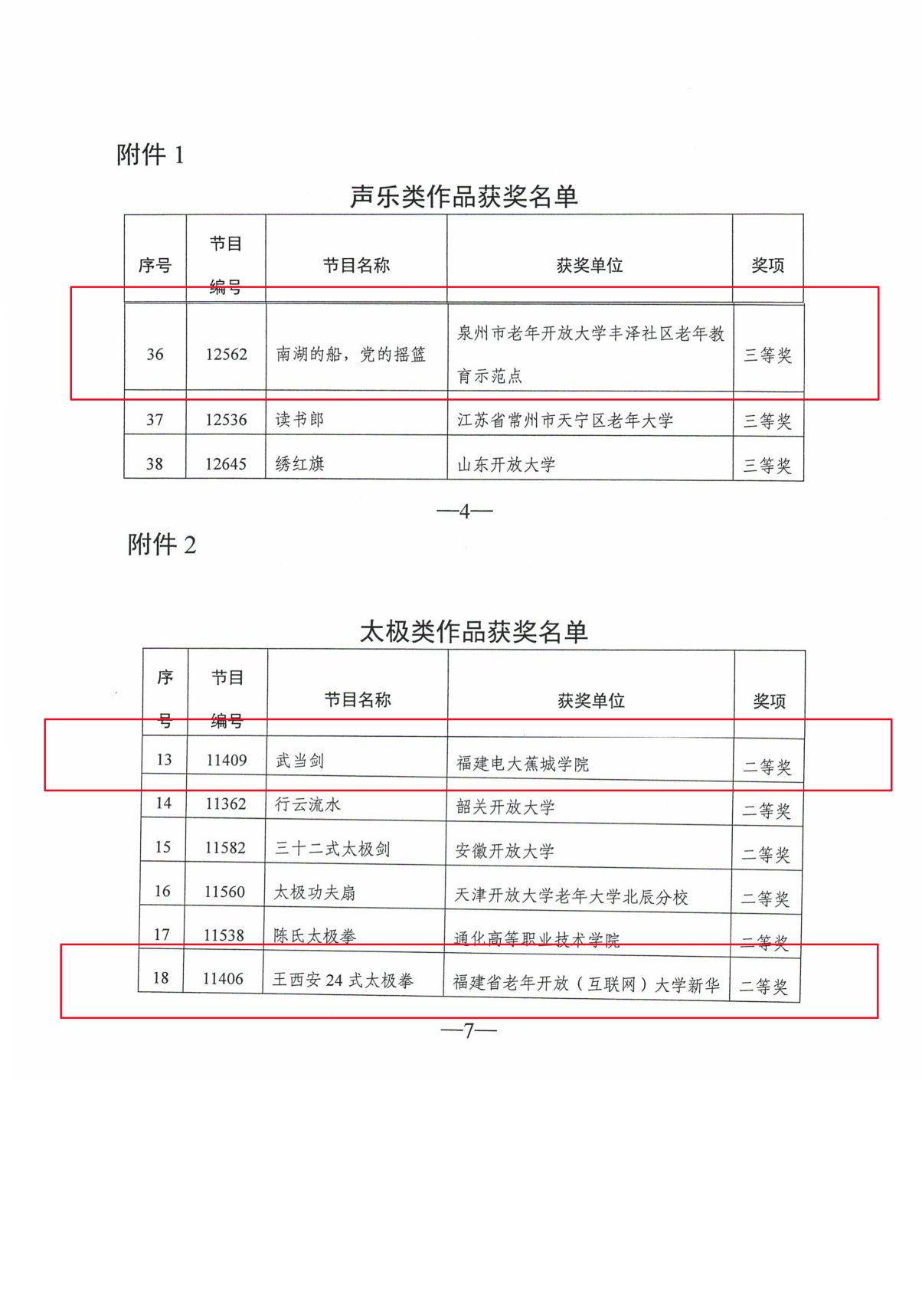 日前,国家开放大学公布首届全国老年教育教学成果展(第二批)评奖结果。福建老年开放(互联网)大学体系共10个节目获奖,其中声乐类1个,太极类2个,表演和器乐类7个(含戏曲类4个)。至此,本届成果展6类作品获奖名单及优秀组织单位获奖名单都已公布。福建地区本届获奖作品16个,优秀组织单位4个。