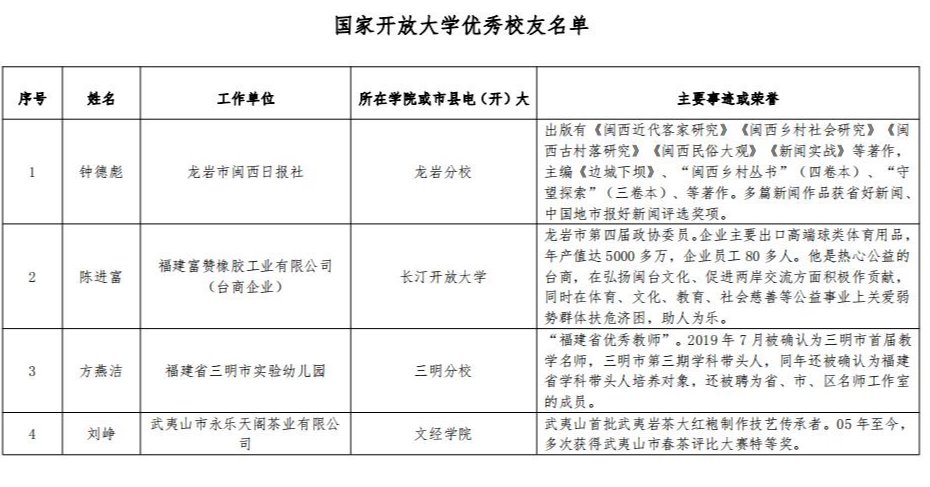 近日,国家开放大学印发《关于公布国家开放大学杰出校友、优秀校友名单的通知》,我校推荐的20位校友悉数被授予国家开放大学杰出校友、优秀校友称号。其中,国家开放大学授予黄志丽、郑月娥、钟兆云、郭正光等15位校友“国家开放大学杰出校友”称号,追授肖毅“国家开放大学杰出校友”称号,授予钟德彪、陈进富等4位校友“国家开放大学优秀校友”称号。